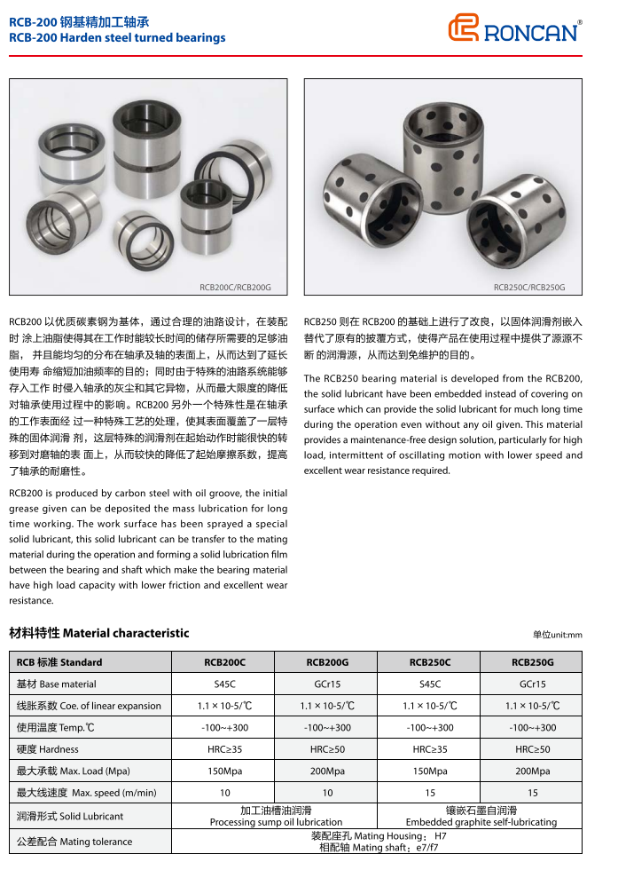 RCB200以優質碳素鋼爲基體,通過合理的油路設計,在裝配時塗上油脂使得其在工作時能較長時間的儲存所需要的足夠油脂,并且能均勻的分布在軸承及軸的表面上,從而達到了延長使用壽命縮短加油頻率的目的;同時由于特殊的油路系統能夠存入工作時侵入軸承的灰塵和其它異物,從而最大限度的降低對軸承使用過程中的影響。RCB200另外一個特殊性是在軸承的工作表面經過一種特殊工藝的處理,使其表面覆蓋了一層特殊的固體潤滑劑,這層特殊的潤滑劑在起始動作時能很快的轉移到對磨軸的表面上,從而較快的降低了起始摩擦系數,提高了軸承的耐磨性。